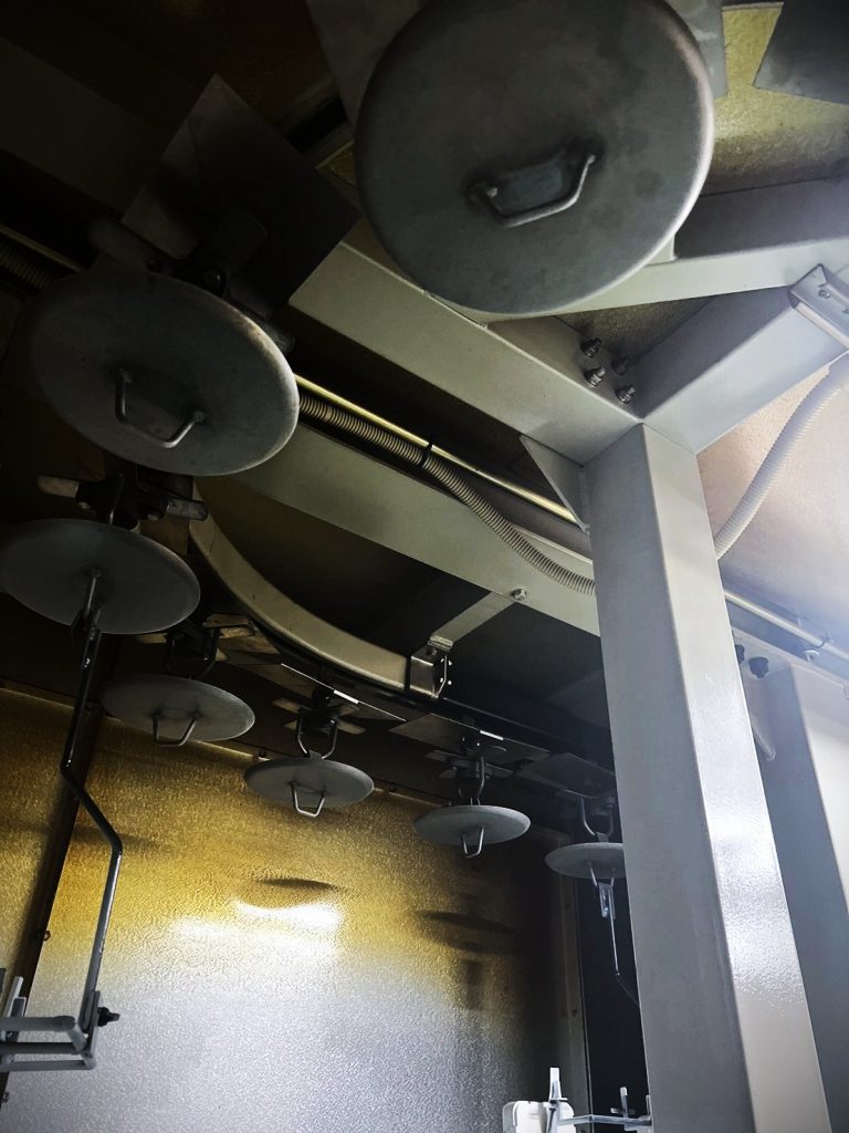製品をハンガー治具に吊り下げたまま搬送・乾燥可能。